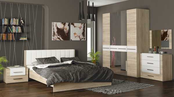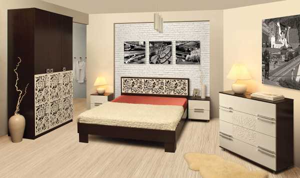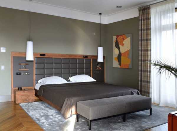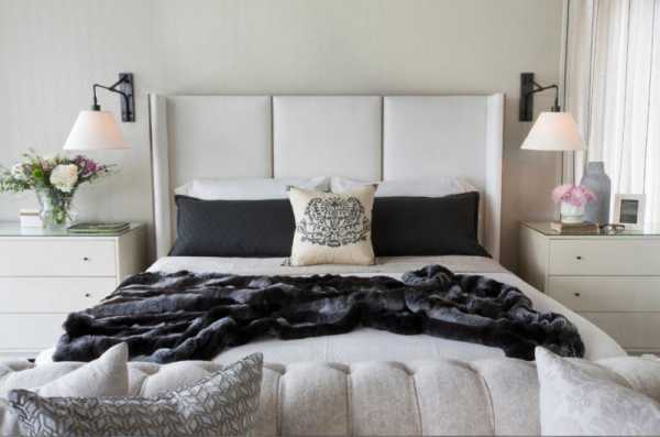Кровать, шкаф и тумбочки в красивой спальне должны быть из одной коллекции.Отделка