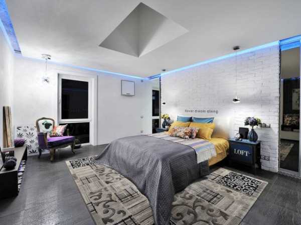 Светящийся натяжной потолок красиво смотрится ночью. - Всем известен фокус с зеркальным потолком, который, по словам хозяев таких красивых спален, настраивает на эротические фантазии. Для простого обывателя, считающего, что это слишком агрессивно, есть другой вариант — сделать подсветку на потолке. Она также создает интимную обстановку.