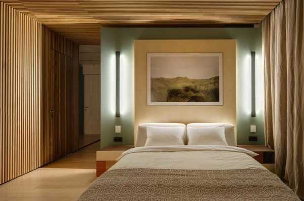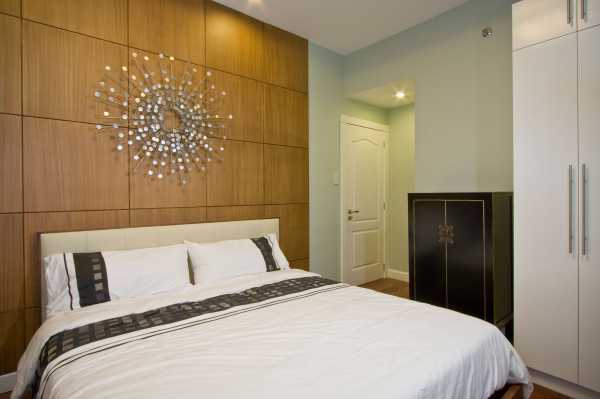 Сделать спальню более уютной поможет фальш-стена. Она закроет все, что не вписывается в понятие удобства и комфорта.