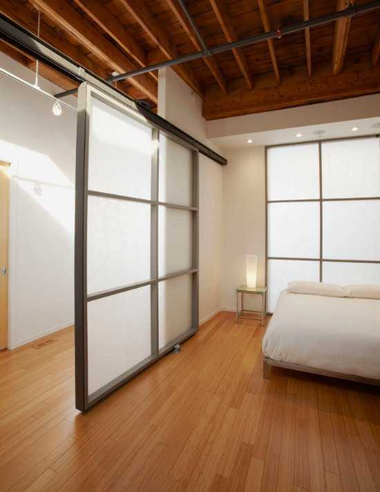 | На фото дизайн спальни-гостиной, оптимальное зонирование | Если по каким-то причинам спальня не может служить отдельным помещением в квартире (например, она одновременно является гостиной или столовой), в этом случае целесообразно позаботиться о грамотном зонировании помещения.Для этой цели принято использовать двери на роликах, ширму, стеллажи или другие дизайнерские идеи. |