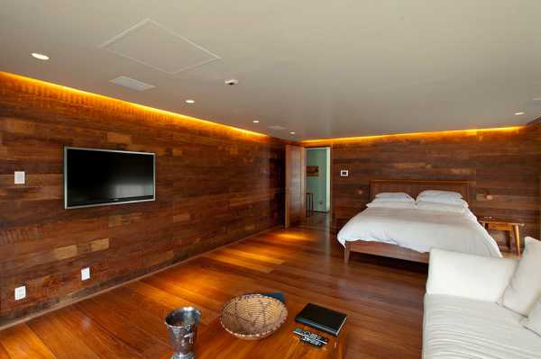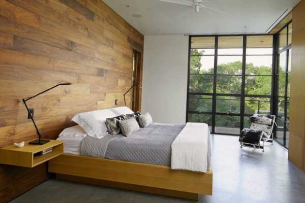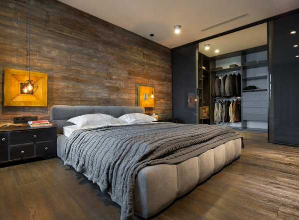 Для более необычного оформления сделайте отделку потолка с такого материала, как и пола. Если говорить о стенах, то выбирайте обои одного цвета. Имея большую спальню, по желанию сделайте фото принт на всю стену.
