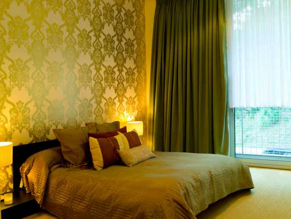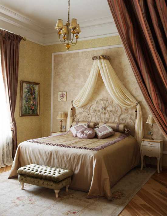 Выражение самодостаточной роскоши. Используются некричащие цвета и оттенки: горчичный, оливковый, бежевый. Это богатые предметы интерьера: массивная люстра, тяжелые шторы. Такие шикарные красивые спальни могут быть у респектабельных людей, которые многого добились в жизни.