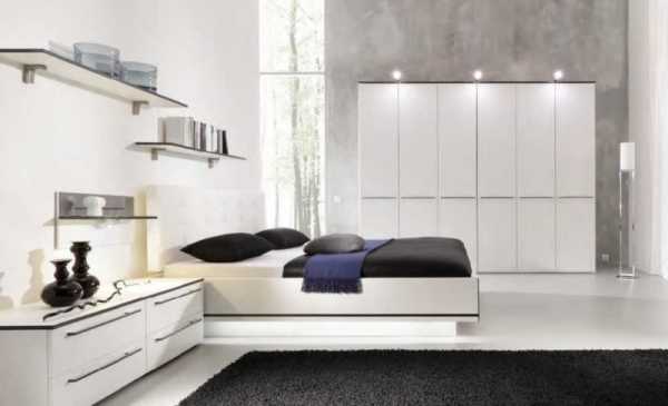 Белая мебель в спальнеРазличные дизайнерские идеи могут быть предложены и для того, чтобы организовать хранение даже в не слишком большой спальне. Помимо шкафов, как встроенных, так и обычных, можно также задействовать стены, разместив на них полки для коробок с мелочами. Дополнить шкаф может также комод, тумбочки или трюмо. Очень функциональное решение проблемы хранения — это ящики под кроватью, которые позволяют убрать все лишнее и при этом сэкономить место в помещении. Что касается выбора спального места, то, конечно же, оптимальным вариантом является именно кровать, однако возможен также выбор дивана с ортопедическим матрасом, который не наносит вреда позвоночнику и при этом не занимает слишком много места в комнате.