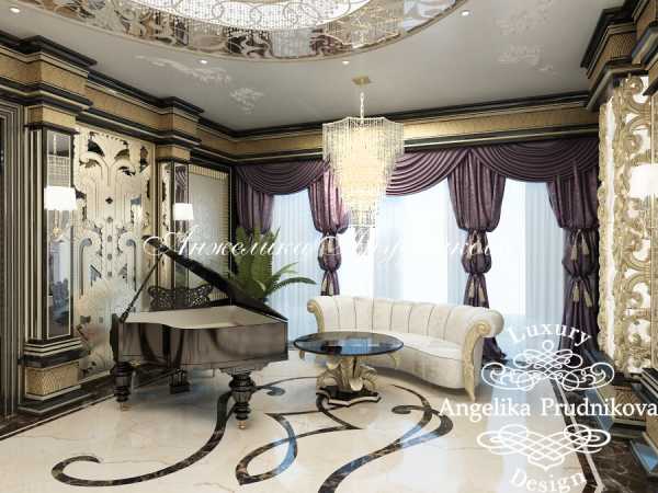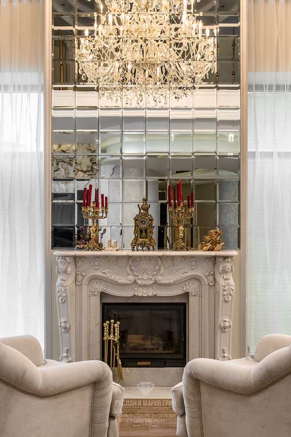 Основными предметами декора могут стать классический камин, напольные часы, пейзажи в массивных позолоченных рамах.
