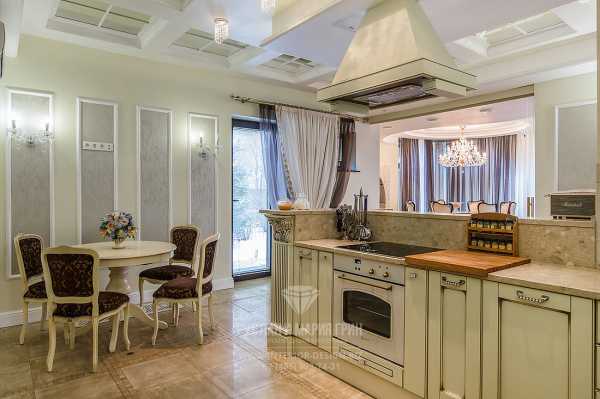 На фото: Гостиная-столовая с барной стойкой и классическими люстрами в КП «Верхнее Валуево»Изысканные дворцовые люстры с позолоченным каркасом, обилием хрустальных подвесок и имитацией свечей в дизайне загородного дома выглядят роскошно. Они подходят для любых классических интерьеров, хорошо смотрятся в сочетании с традиционной лепниной и в обрамлении ультрасовременной светодиодной подсветки. При этом такие светильники могут не только «солировать» в интерьере, но и быть частью сложного проекта освещения с большим количеством источников света.