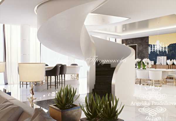 На фото: Белая гостиная с современной спиралевидной лестницейБелый зрительно расширяет пространство и наполняет его светом, поэтому декораторы часто используют его в дизайне загородных домов. Но чтобы добиться нужного эффекта, белый цвет должен быть доминирующим. Это особенно важно при оформлении многофункциональных гостиных, где много крупногабаритных объектов или холлов с монолитной винтовой лестницей, которую необходимо визуально облегчить. А чтобы интерьер не выглядел скучным, белый цвет можно слегка «разбавить», выкрасив одну из стен в бирюзовый, графитовый или лимонный оттенок.