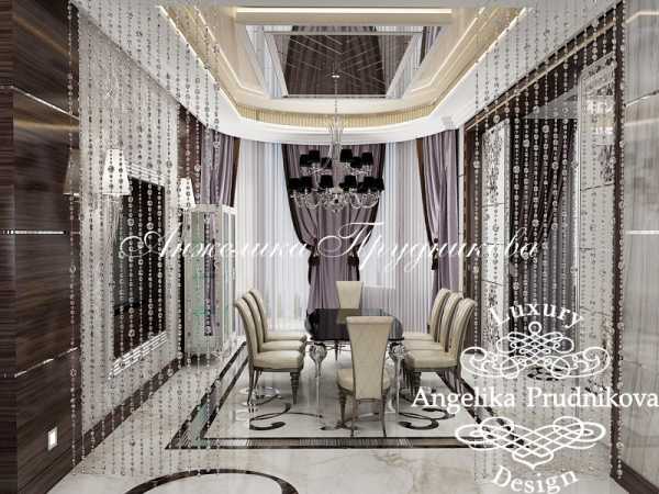 На фото: Хрустальные шторы в декоре столовой в КП «Монтевиль»Хрустальные шторы можно с полным правом назвать функциональным декором, ведь они используются не только для украшения, но и для зонирования помещений, создавая конкуренцию ширмам, резным перегородкам и портьерам. Их сверкающие нити хорошо сочетаются с зеркалами, каскадными люстрами, мраморной отделкой, темным деревом и идеально подходят для стилей арт-деко и неоклассика. Присутствие такого эффектного элемента в дизайне частного дома позволит усложнить интерьер. А чтобы акцентировать внимание на хрустальных шторах, их можно подсветить LED-лентой.