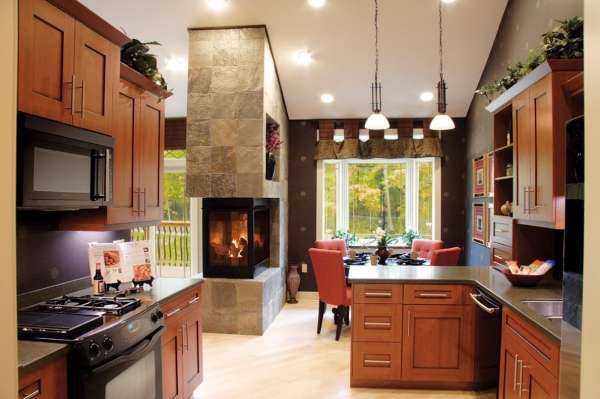 Приоритет в оформлении кухни – функциональность помещения, немалую часть которого занимает бытовая техника. Владельцы небольших загородных домов часто прибегают к созданию совмещённой кухни-гостиной, которую можно отделывать более ярко. Если же помещение для приготовления пищи изолировано, то выбранный стиль интерьера лучше всего подчеркнуть отделкой стен, полов и потолков, а предметы декора и осветительные приборы устанавливать, опираясь на их функциональность.