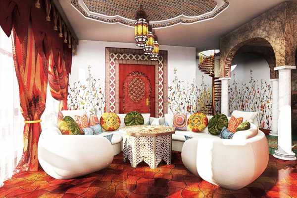 Насыщенная цветовая гамма, обилие золота и арочных элементов оформления придают арабскому стилю энергичность, делают помещение более ярким. Сочетание насыщенных оттенков, затейливого декора и тяжёлых портьер (чаще всего из искусственной парчи или тафты) требует знаний колористики, но получившийся дизайн интерьера дома стоит затраченных усилий.