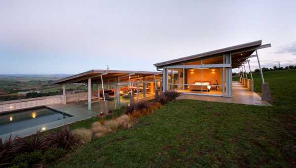 Волнистая линия односкатной кровли смягчает геометрическую строгость фасадов дома, построенного из стекла и металла.