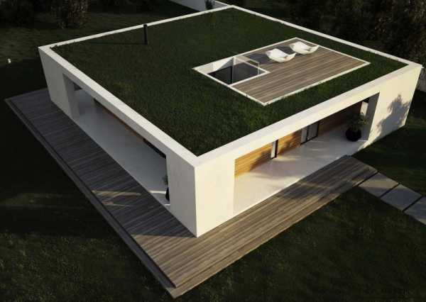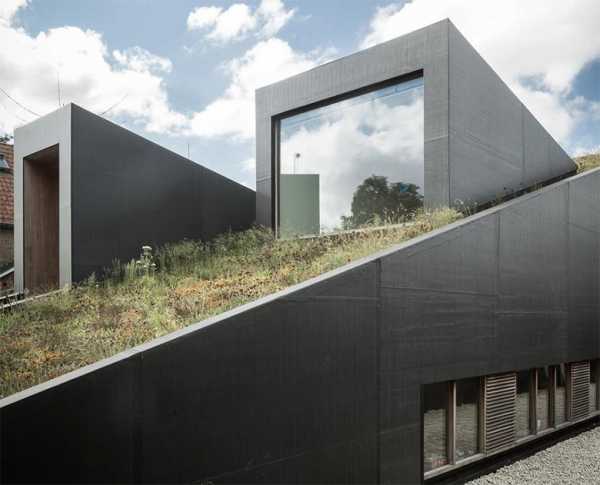 Зеленая кровля ощутимо смягчает урбанистическую архитектуру частного дома на фото.