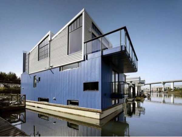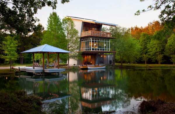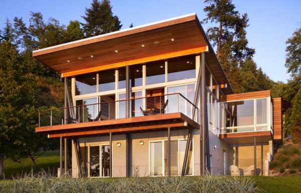 Оригинальность проекта частного дома на фото — уклон односкатной крыши, направленный в сторону водоема для оптимального стока ливневых вод.