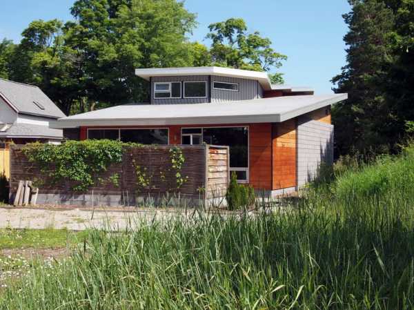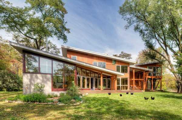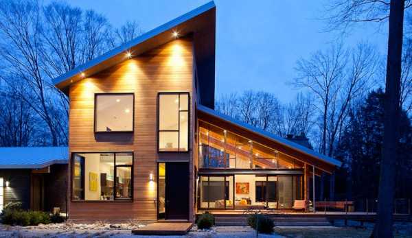- Оригинальный результат при проектировании домов на основе односкатных крыш достигается, если жилище разделено на отдельные блоки. Каждый такой блок может иметь собственную односкатную крышу, но направление их может быть самым различным. Архитекторы разрабатывают оригинальные варианты таких сооружений, каждый из которых несёт в себе собственную индивидуальность. Для северных районов наклон крыши должен обеспечивать гарантированный сход снежного покрова без накопления большой массы на поверхности.