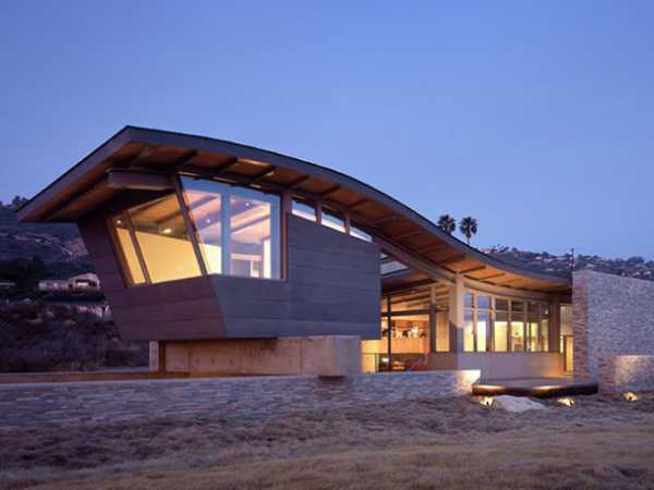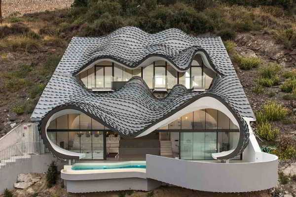 Крыша коттеджа на фото имеет нетривиальную форму набегающей на берег волны, что подчеркивает ультрасовременную стилистику архитектуры.
