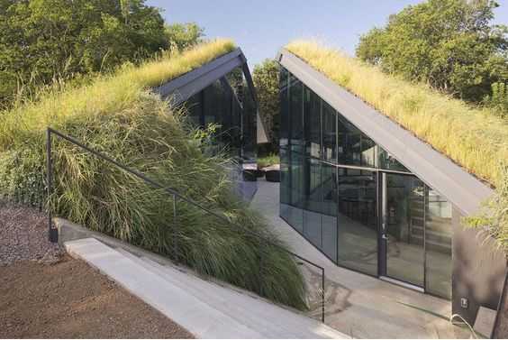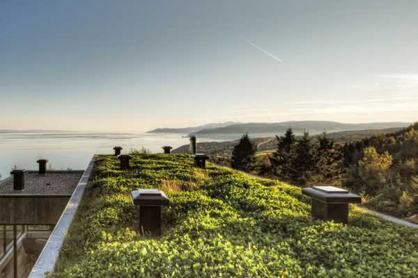 Строгие геометрические объемы современных зданий часто контрастируют с естественным ландшафтом, а зеленая кровля служит объединяющим элементом, как на фото. Здесь травяной газон на крыше дома постепенно переходит в растительность на холме и создает единую плоскость, как бы сливаясь с природой.