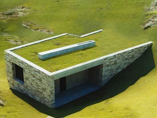 Задуманный как геологическое образование, которое возвышается над равнинным ландшафтом, этот дом в Великобритании имеет уникальную односкатную кровлю-лестницу, выложенную кремниевой плиткой. Такая современная архитектура контрастирует и одновременно дополняет природное окружение благодаря естественности своих форм и оттеночных переходов от темно-серого к белесо-дымчатому.