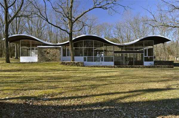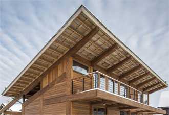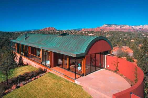 Такой коттедж с деревянным каркасом, стеклянными фасадами и дуговидной крышей сразу же притягивает взгляд необычностью формы, напоминающей глаз.
