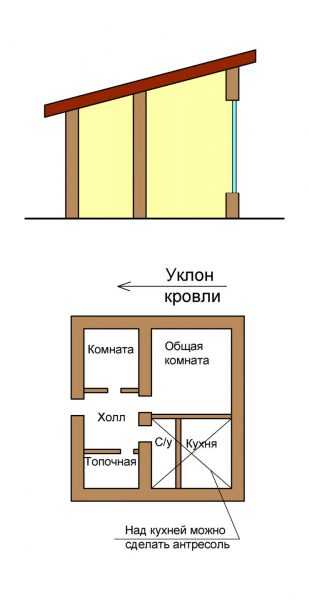 Дома с одной односкатной крышей обычно имеют средние размеры и небольшую площадь. При их проектировании следует обращать внимание на рациональное использование полезного пространства. Ввиду неравномерной высоты потолков самые высокие помещения следует отводить под общие комнаты, гостиные. Под спальни и вспомогательные помещения можно выделять комнаты с более низкими потолками.