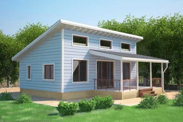 Каркасный деревянный домик с мансардой и односкатной кровлей — практичная конструкция для летней дачи за городом.