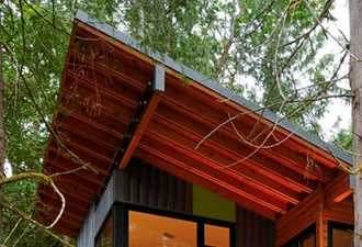Большие свесы крыши не создают опасности разрушения, поскольку окружающие деревья надёжно защищают дом от ветра