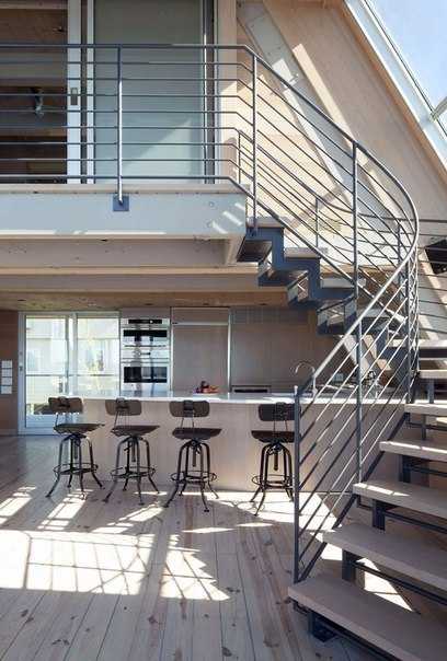 Нередко в домах такой формы сооружают надстройку. Здание получает не слишком высоким, поэтому под условный второй этаж отводят только половину. Под крышу ставят кровать, а нижний уровень занимают другой полезной обстановкой, в том числе санузлом. Для лестниц используют один из экономичных вариантов: