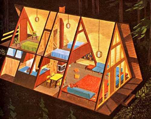 Именно простота конструкции и подкупила архитекторов, первый дом в виде шалаша построили в Калифорнии еще в 30-е годы. Видимо, американцев вдохновили вигвамы индейцев. Основателем особого архитектурного стиля считается архитектор Рудольф Шиндлер, а популяризировал идею каркасных треугольных домов Эндрю Геллер уже в 1955, его Дом Риз в Лонг-Айленде привлек внимание архитекторов со всего мира.
