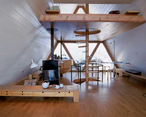 Если просто сложить «коробку» в одну комнату с покатыми стенами, она будет давить на психику. Поэтому архитекторы максимально облегчают восприятие пространства внутри дома. Приёмы:
