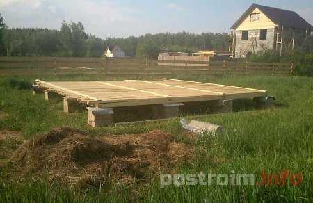 Пока трамбовал, заказал блоки. Привезли и выгрузили манипулятором на поддонах. Привез на машине цемент, начал класть «фундамент». После этого выжидал две недели, поливая столбики и накрывая их рубероидом.