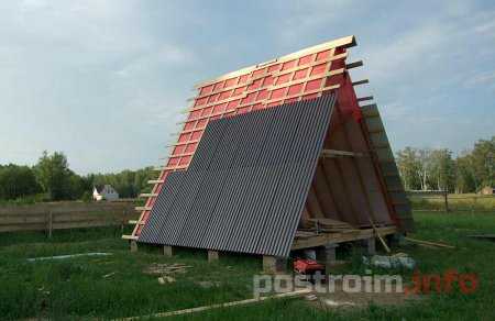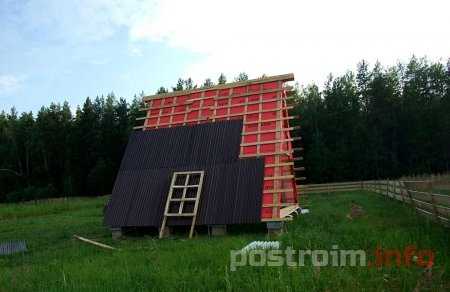 Наличие даже не самого огромного опыта позволяет самостоятельно проводить все работы по постройке. Конструкция имеет не сложную форму – стандартная удлиненная двускатная кровля с деревянным каркасом внутри.