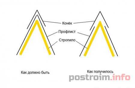 Когда положил весь профлист, то увидел свою очередную ошибку: листы профлиста, лежащие на разных скатах не сходились в вершине. И не сходились порядочно, сантиметров 20-25. Найти такой конёк проблематично, объезд всех магазинов в районе не дал ничего.Мне подсказали компанию, где могут сделать на заказ. Их цена за нужный мне конёк была, мягко говоря, дороговата. И тут меня осенило – у нас на работе есть листогиб. Мне необходим только плоский лист нужного цвета. Этот лист я нашел в том же магазине, где брал и профлист. Взял 4 листа.