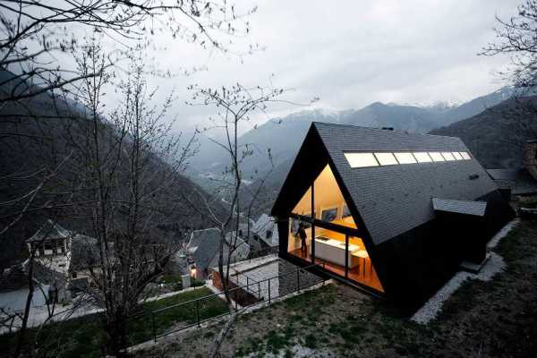 Треугольная форма дома шалаша может и не очень подходит для городских условий, зато это отличный вариант для загородных коттеджей. На природе – в лесу, в горах дом шалаш всегда выглядит естественно.