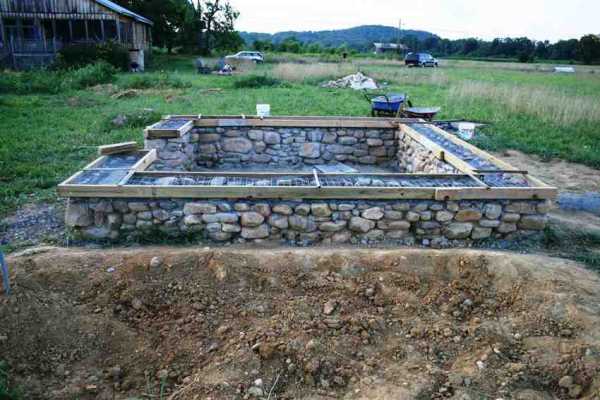 В назначенных местах устанавливаются металлические закладные. Затем на подушку укладывается первый ряд бутового камня, который заливается бетоном. Затем кладутся по очереди все последующие ряды, которые также сразу заливаются раствором.