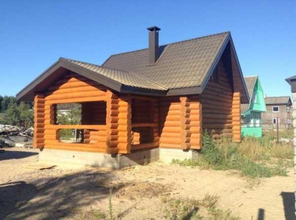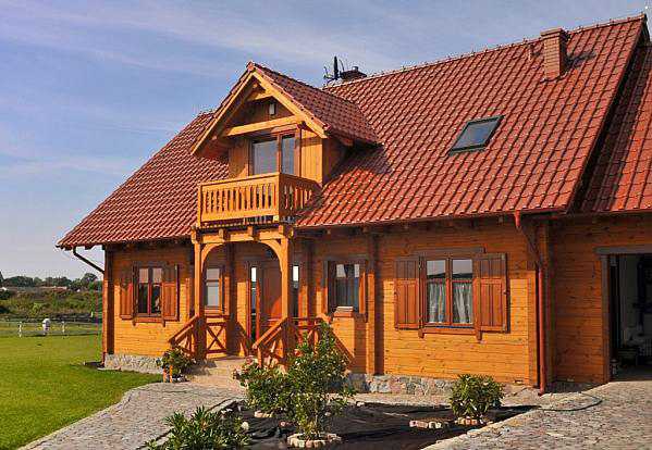 Двускатная кровля из металлочерепицы медно-красного оттенка удачно вписывается в архитектурную концепцию дома, выдержанного в деревенском стиле. Брусовые стены из хвойной породы медового тона прекрасно гармонируют с кровельным покрытием в теплой цветовой гамме.