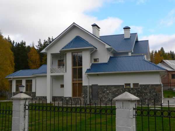 В том случае, когда фасады облицованы несколькими материалами, имеющими различный цвет и фактуру, лучше всего подойдет сдержанная крыша из серой металлочерепицы.