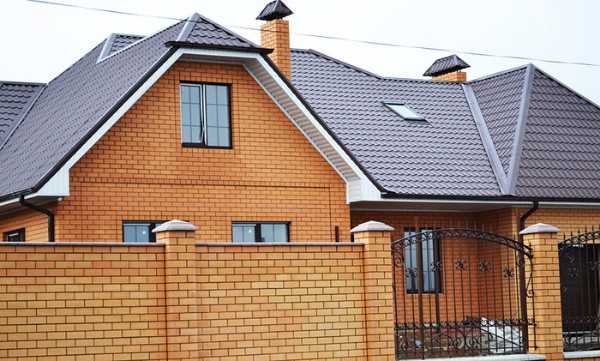 Кровля из металлочерепицы табачно-серого цвета по-своему универсальная — она хороша для домов, построенных как из красного, так и из светлого кирпича.