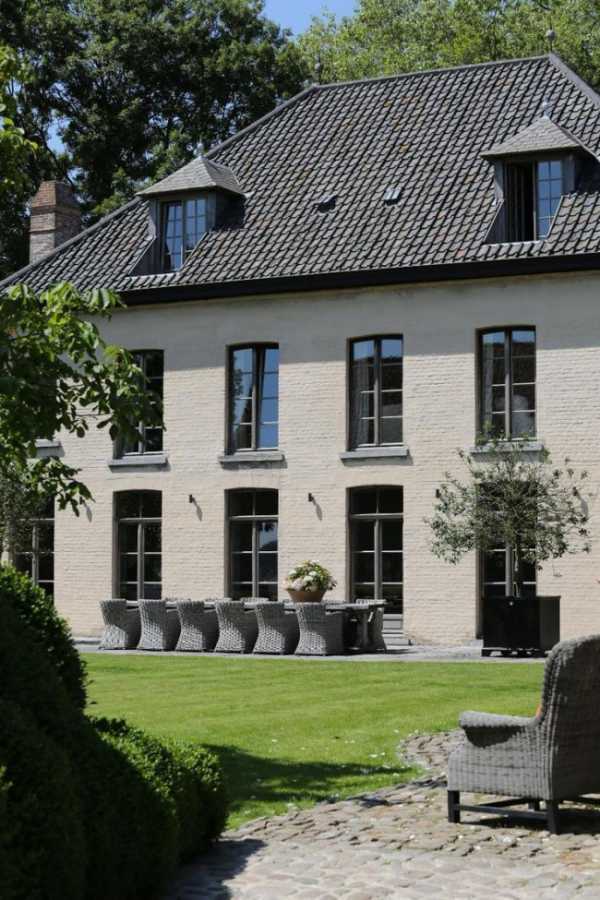 Дом в классическом стиле на фото — пример того, насколько красивой может быть колористика здания на базе тональных нюансов. Цельность внешнего вида здания достигается за счет комбинации голубовато-серой двухскатной кровли со светло-серыми кирпичными стенами.