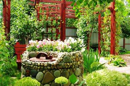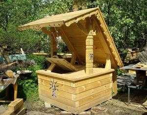 Перед оформлением водоисточника следует определиться с его функциями и внешним видом: можно соорудить вместо миниатюрной избушки из бруса треугольную крышку, которая будет иметь не декоративную, а скорее, защитную функцию. А небольшого размера деревянная беседка для хранения инвентаря в период его неиспользования способна защитить источник от мороза и снега.