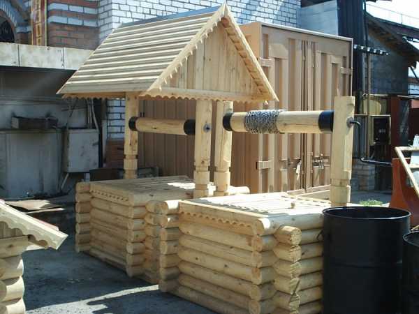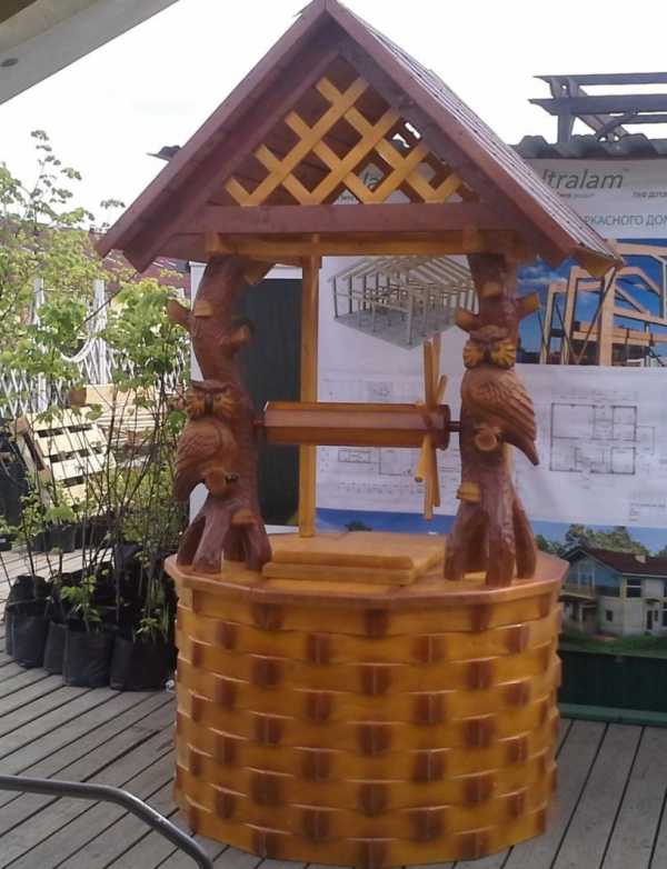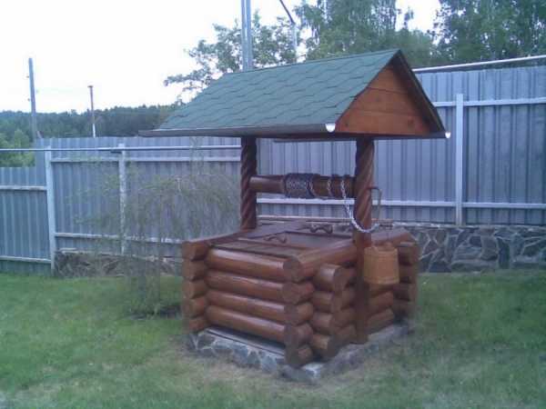 - Наиболее подходящим материалом для обустройства скважины является дерево. С его помощью можно создать над скважиной резьбленную избушку, которая послужит ярким украшением садового ландшафта.