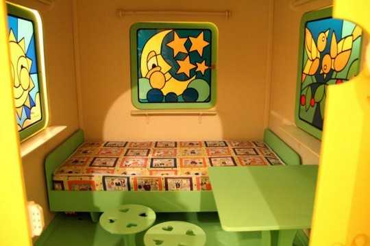 - Внутренняя отделка. Стены из все тех же бревен, пол деревянный, на нем домотканый (хотя бы на вид) ковер — на нем детям удобно, мягко играть. В углу — сложенная из кирпича, беленая маленькая печка, в которой, конечно, по-настоящему ничего не испечь, но можно отлично играть в тот же Колобок.
