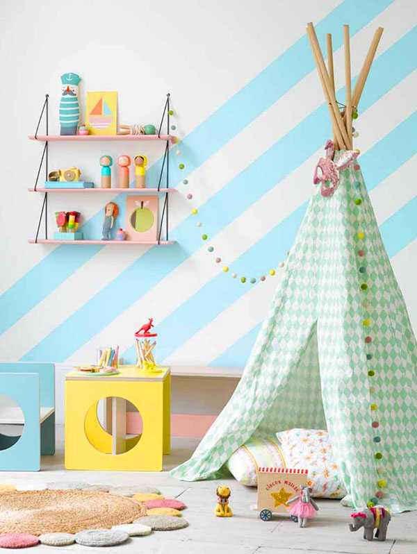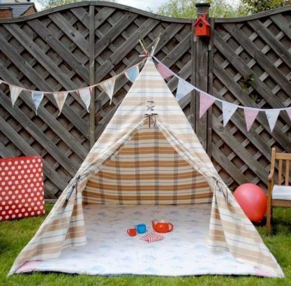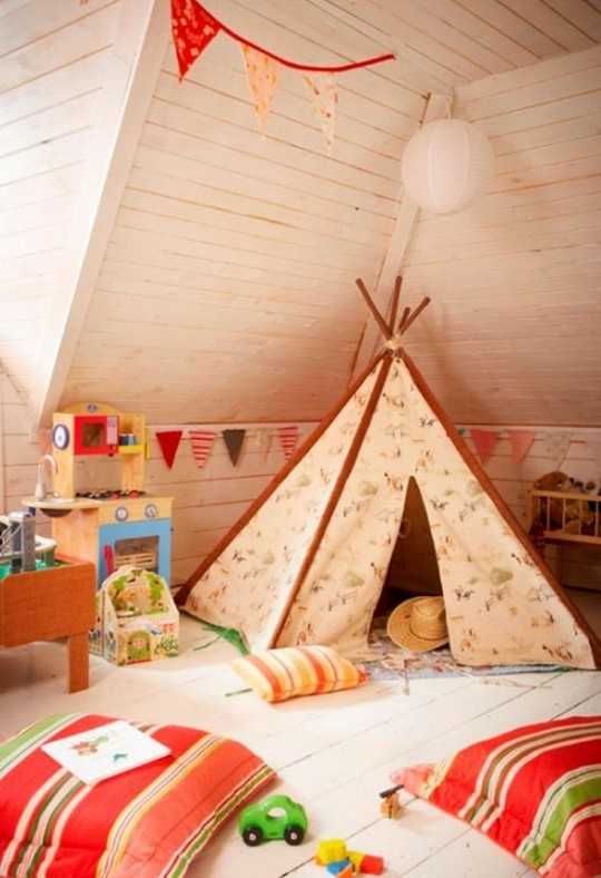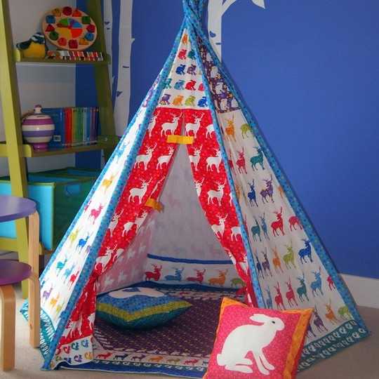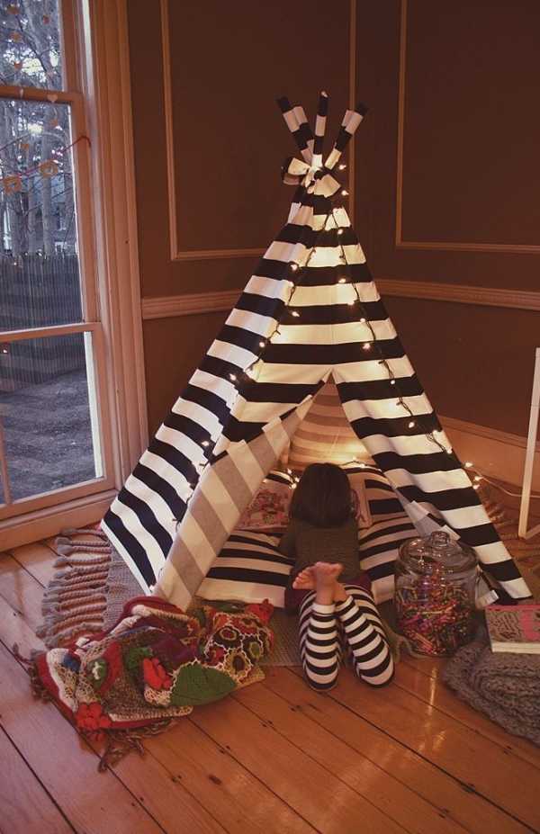 Самый быстрый вариант игрового домика – индейский вигвам. Несколько опор, тканевое полотно и сооружение готово. Его легко передвигать по комнате, что особенно нравится малышам.