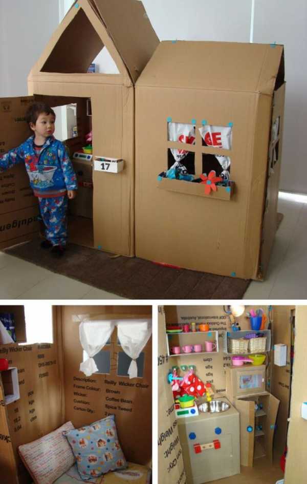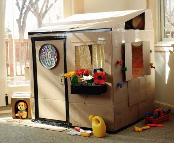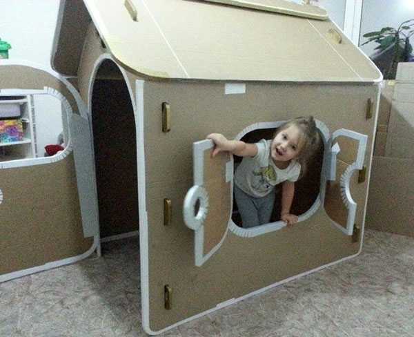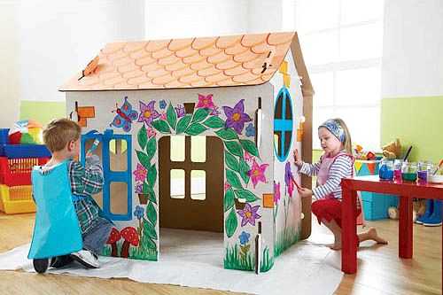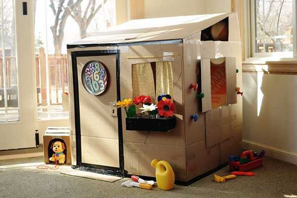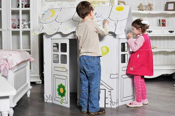 Оригинальный вариант игрового домика для занятых родителей – сделать его из подручных материалов. Нередко это может быть плотный картон. Лучше использовать стандартные листы, которые легко кроить, а потом соединять в конструкцию.