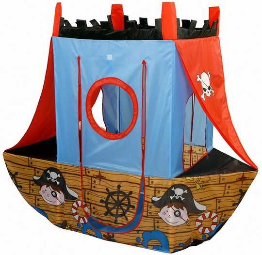 - Внешнее оформление. Стены повторяют форму пиратского корабля, вместо крыши, собственно, палуба. Можно сделать обычную дверь, а можно — круглый люк в крыше, как на настоящем корабле. Тогда ребенку нужно будет подняться по веревочной лестнице на палубу и спуститься через люк. Подобные упражнения полезны для координации, но если ребенок неуклюж, лучше от них отказаться.