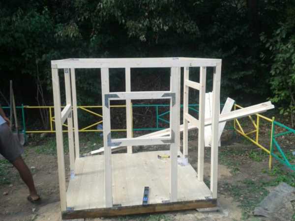- прикрепить к каркасу брусья стен — по четыре на углах, по два там, где будут окна и двери, на оставшейся свободной стене один, сверху закрепить каркас, аналогичный фундаментному;