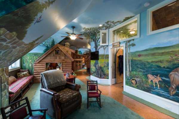 - Использовать не только простые лак с краской. Можно расписать стены интересными рисунками (например, любимыми персонажами мультфильмов), можно нарисовать красивые узоры, а можно украсить их затейливой резьбой. Даже витраж вместо обычного стекла в окошке будет смотреться красиво.