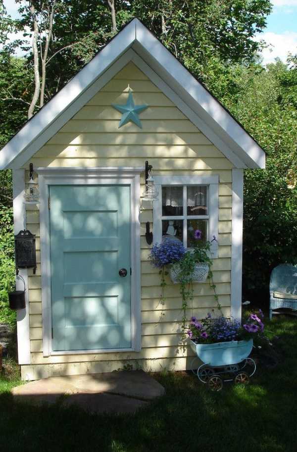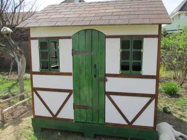 - Внешнее оформление. Стены покрасить, дверь сделать филенчатую, красивую. Окна простые, с прямоугольными ставнями. Перед входом можно разбить клумбы, за которыми дети смогут ухаживать, если захотят. Цвета — пастельные, с яркими акцентами на крыше и двери.