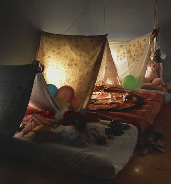 Создавая домик для детей в квартире своими руками необязательно приобретать новую ткань. Оригинально выглядят палатки из старых покрывал или остатков плотной портьерной ткани. Придать домику особый вид помогут окна, которые делают из полиэтилена. На входе устанавливают надежный замок в виде обычной молнии. Полы в этом сооружения делают из матраса либо плотного одеяла. Здесь ребенку будет уютно, тепло и приятно проводить свой досуг.