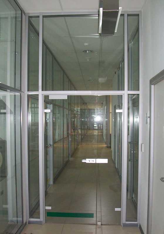 Монтаж дверей в алюминиевой раме из стекла занимает минимум времени и не предполагает проведения «мокрых» работ, что очень удобно, поскольку позволяет проводить монтажные работы, не изменяя графика функционирования предприятия.