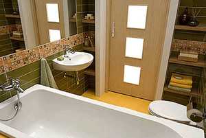 Деревянные двери в ванную и в туалет необходимо пропитать антисептическим средством и залакировать. Желательно, чтобы дверной проем в помещение санузла находился как можно дальше от кранов с горячей и холодной водой. Данный вариант дверей тоже обойдется покупателю недешево. - Востребованы у покупателей ДСП и МДФ двери с покрытием из ламината. Конструкции этого вида хорошо подойдут для помещений с повышенной влажностью воздуха, их формы стильны и многообразны, а основное их достоинство – недорогая стоимость.