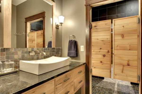 Если в доме решено установить двери из массива, то для ванной и туалетных комнат лучше выбирать модели из дорогих пород – бука, красного дерева, дуба и им подобным, с большой плотностью структуры. Именно такую древесину используют при обустройстве парилок в банях (саунах).