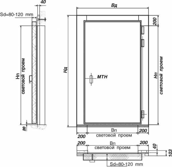 По высоте распространен стандарт дверей 2050 мм, где тоже важно предусмотреть место для порога и монтажного зазора. Толщина стены необходима для определения сечения короба, который может быть шириной 65-120 мм, и места создания узлов крепления — в коробке или на выносных проушинах.